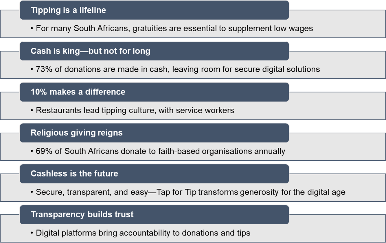 Welcome to Tap For Tip, a cashless solution designed to simplify and modernise the way you give. Whether you're showing appreciation to service providers like car guards or contributing to church offerings, Tap For Tip makes it effortless and secure with a simple card tap. Our innovative system ensures transparency and fairness, allowing tips to be pooled and distributed equitably among service teams while enabling seamless contributions to your church community. Join us in transforming generosity into a digital experience that’s convenient, inclusive, and impactful for everyone.
